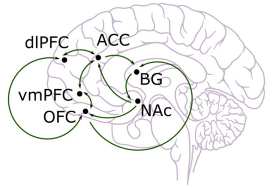 Anatomical illustration of dorsolateral prefrontal cortex (dlPFC), anterior cingulate cortex (ACC), ventromedial prefrontal cortex (vmPFC), orbitofrontal cortex (OFC), basal ganglia (BG), and nucleus accumbens (NAc) [55].