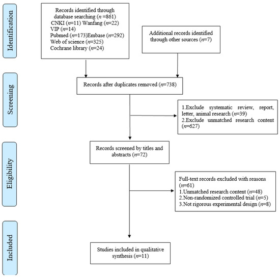 The initial research resulted in 868 references. After duplicates were removed, the titles and abstracts of 738 studies were reviewed. Following a screening of potential studies, 666 studies were excluded and 72 studies were retrieved in full-text, 61 of which did not match the eligibility criteria. The final 11 studies were included in the meta-analysis (Figure 1).