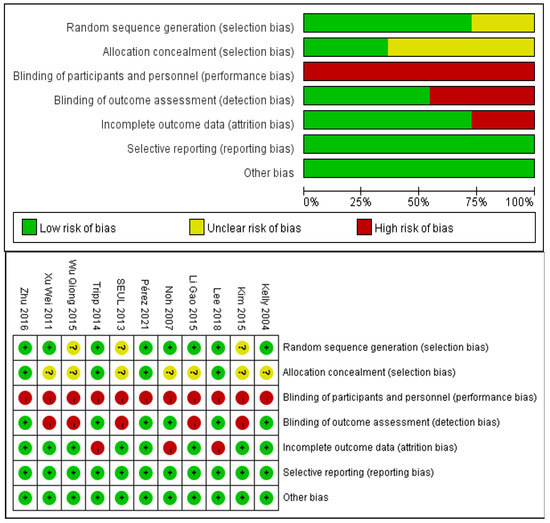 The methodological quality and risk of bias of the studies included were assessed by two authors using the Cochrane Handbook for Systematic Reviews of Interventions 5.0.1, which includes random sequence generation, allocation concealment, the blinding of participants and personnel, the blinding of outcome assessment, incomplete outcome data, selective reporting, and other biases. The risk of bias was assessed in each domain as “low risk”, “unclear”, or “high risk” [20]. The higher the total score, the higher the methodological quality of the study (5–7 high, 3–4 moderate, 0–2 low). Disagreements were resolved by consensus.