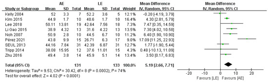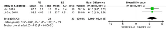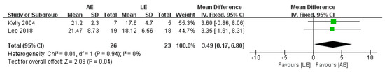 Three studies with a total of 46 patients reported a significant difference in FIM between AE and LE (fixed-effects model: MD = 6.1; 95% CI: 4.05 to 8.15; p < 0.00001) (Figure 8). The test for heterogeneity was not significant (p = 1.00; I2 = 0%).
