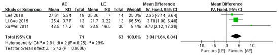 FMA was reported by three studies that included a total of 134 patients with stroke. The meta-analysis showed a significant improvement for patients in the AE group compared with the LE group (fixed-effects model: MD = 3.84; 95% CI: 1.64 to 6.04; p = 0.0006) (Figure 4). The test for heterogeneity was not significant (p = 0.25; I2 = 29%).
