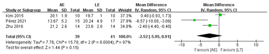 Three studies with a total of 80 patients reported no difference in TUGT between AE and LE (random-effects model: MD = −2.52; 95% CI: −5.95 to 0.91; p = 0.15) (Figure 5). The test for heterogeneity was significant (p = 0.0004; I2 = 87%). Sensitivity analyses were conducted to explore potential sources of heterogeneity; the exclusion of individual studies did not substantially alter the heterogeneity.