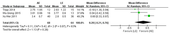 FAC was reported by three studies that included a total of 132 participants with stroke. The meta-analysis showed no significance for participants in the AE group compared with the LE group (random-effects model: MD = 0.28; 95% CI: −0.21 to 0.76; p = 0.26) (Figure 6). The test for heterogeneity was significant (p =0.07; I2 = 63%). Sensitivity analyses were conducted to explore potential sources of heterogeneity; the exclusion of individual studies did not substantially alter the heterogeneity.