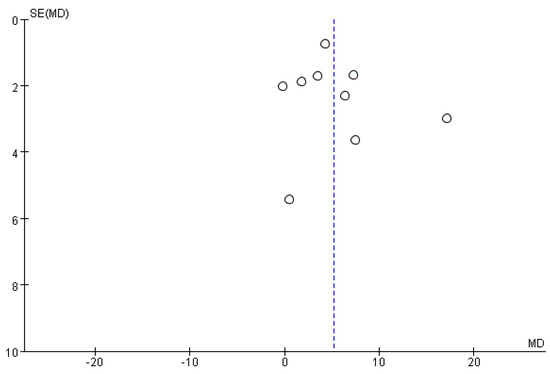 Funnel plots did not show any significant publication bias for the primary outcome of BBS, meaning that there was no asymmetric relationship between treatment effects and study size (Figure 9).