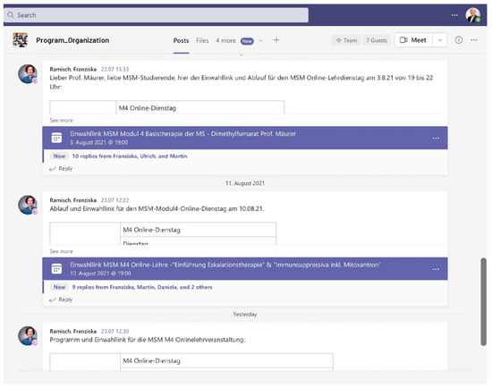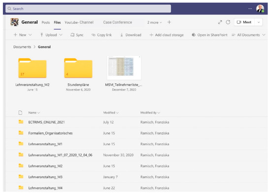 Microsoft Teams [14,15] is used as a technological basis for the MSM Master’s program in learning, teaching, collaboration, and cooperation processes, which has proven particularly effective during the COVID-19 pandemic. Since the services are cloud-based and software updates are provided automatically in the so-called “evergreen mode“, there is no need for technicians and IT teams to support the platform itself after the initial setup. Microsoft Teams serves as a digital hub that brings together conversations, content, tasks and apps in one place. The digital hub provides extensive security and compliance-specific features that will not be discussed here. Rather, the focus is on the analysis of innovative use cases that have been implemented within the MSM Master’s program: one central data platform for highly effective organization of the Master’s program, online classrooms in a distance learning environment for synchronous and self-directed asynchronous learning, flexible knowledge transfer in the learning video portal, and establishment of special learning areas for peer-to-peer learning. The use cases present possible applications of certain tools for students and lecturers in the pandemic situation and show how they were implemented.