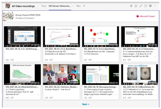 The digital hub allows synchronous lessons, lectures and events to be held in special channels and to securely share and interact on video content from presentations. Microsoft Stream, the video service from Microsoft Teams [18], makes it possible to create live lectures, record them automatically and make them available regardless of location and time. The app simplifies uploading, organizing, and sharing video content across the Master’s program. Students call up the recording of a missed learning session or recall session at a time of their choice in the video portal (Figure 5).