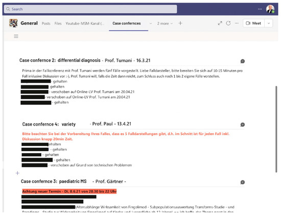 Joint activity learning areas are presented in an organized, structured, and consistent manner. In the MSM master’s program, there are two light house examples of how specific learning areas can be established: case conferences and journal clubs. In the case conference students present their own case or—if they do not have patient contact—a published case to the lecturers and the other students (peer-to-peer-learning). In journal clubs, they discuss professional articles and several students can participate in analyzing a single article. In this process, participants discuss all articles according to fixed criteria: background, method, results, discussion and conclusion. The case conferences and journal clubs are organized using the wiki functionality in Microsoft Teams (Figure 6). Students autonomously enter their contributions into the given schedule grid and provide the information to be presented online. These approaches also allow lecturers to assess students’ learning and experience more deeply regarding their areas of interest.