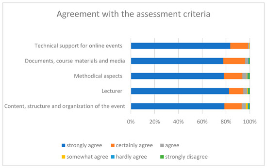 In the category “content, structure and organization of the event”, the students gave strong to certain agreement that the objectives of the event were clearly recognizable (1.26 ± 0.74) and that the content structure (“red thread”) of the overall event was sensible (1.32 ± 0.77), as well as that the event time was used in a way that promoted learning (1.37 ± 0.81). For the students, the relevance of the content covered for practice became clear (1.31 ± 0.75) and they were able to contribute their personal competencies and previous experience appropriately (1.47 ± 1.01). In category “lecturer” the students gave strong to certain agreement that the lecturer has stimulated the discussion of the topics (1.27 ± 0.74), emphasized active participation of the students (1.37 ± 0.89), succeeded in making the event appealing (1.31 ± 0.76) and was appreciative in dealing with students (1.15 ± 0.56). The students also rated the “methodical aspects” very highly. They gave strong to certain agreement, that teaching/learning forms (individual, partner, group work, work in plenary) were appropriate (1.42 ± 0.86), that the lecturer was able to present complex content in an understandable way (1.27 ± 0.72) and gave appropriate feedback or responded appropriately to the group (1.32 ± 0.79). The quality of the media content (presentations, scripts, exercise sheets, e-lectures, etc.) was appropriate (1.32 ± 0.71) and the media and (online) tools used were used sensibly (1.27 ± 0.69)—students gave strong to certain agreement to these items in category “documents, course materials and media: design and use”. Finally, students rated positively the aspects of “technical support of the online events”—they gave strong to certain agreement with the items satisfaction with technical support (1.09 ± 0.31) and supervision during the courses (1.21 ± 0.43), and the suitability of the virtual classroom for the course (1.26 ± 0.54).