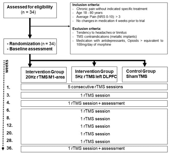 The study was conducted in a single-blinded, randomized, partial placebo-controlled design. It was retrospectively registered at clinicaltrails.gov (registration number: NCT04934150). The experiments took place in the outpatient clinic of the Department of Neurosurgery (Medical University Graz) between February 2019 and March 2020. The patients were allocated into an “M1-group” (5 males, 6 females; mean age ± SD: 53.8 ± 12.7 years), “DLPFC-group” (6 males, 6 females; mean age ± SD: 56.8 + 9.6 years), and “sham-group” (4 males, 7 females; mean age ± SD: 52.5 ± 12.5 years) using permuted block randomization on the online software random.org. Patients were blinded to their assigned group. Each patient in the M1-group and DLPFC-group underwent 13 nrTMS experimental sessions. The first 5 sessions were conducted every day for 5 consecutive days without a break (1 session per day). One week later, the remaining 7 sessions were conducted in a span of 9 months (week 3, 4, 6, 8, 12, 20, 28, and 36). The sham-group followed the same schedule; however, the experiment was stopped after the seventh session (4th week) because of ethical considerations. Each session started with head/brain and TMS coil co-registration. Subsequently, stimulation intensity was determined, and target areas underwent stimulation. Pain assessments before and after stimulation using numerical pain rating scales (NPRS) were conducted on the first (baseline), 7th (4th week), and 13th (36th week) experimental sessions (Figure 1). NPRS scores were documented through an interview before and after stimulation. An experimental session including the preparations lasted for approximately 30 min.