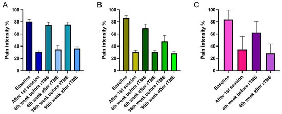 rTMS effects on pain intensity in the M1 (A), DLPFC (B), and sham group (C). The y-axis indicated the mean pain intensity expressed as a percentage (%). The x-axis indicates the time points (in weeks) of conducted measurements. Error bars depict the standard error of mean (SEM).