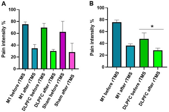 rTMS effects on pain intensity between the groups on the 4th week (A) and 36th week (B). The y-axis indicates the mean pain intensity expressed as a percentage (%). The x-axis depicts the time points (in weeks) of conducted measurements. The * symbols indicate significant group differences (Bonferroni corrected, two-tailed, paired t-test, p ≤ 0.05). Error bars depict the standard error of mean (SEM).
