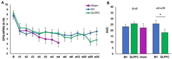 rTMS effects on pain intensity. (A) Mean GPQ-NPRS across sessions and stimulation conditions. (B) The area under the curve (AUC) across stimulation conditions from baseline up to the 5th day of stimulation (left) and from the 6th week until the 36th of stimulation (right). B = baseline; d = day; w = week; GPQ-NPRS = German Pain Questionnaire-Numerical Pain Rating scale; M1 = primary motor cortex; DLPFC = dorsolateral prefrontal cortex; Error bars denote standard error of mean (SEM). The * symbol indicates significant group differences (p ≤ 0.05).