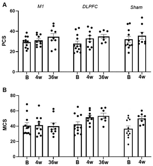 rTMS effects on SF-12 physical composite summary (A) and mental composite summary (B). The y-axis indicates the mean score, and the x-axis indicates the time points (in weeks) of conducted measurements. Each dot indicates the individual patients’ summary. PCS = physical composite summary; MCS = mental composite summary; B = baseline; w = week; M1 = primary motor cortex; DLPFC = dorsolateral prefrontal cortex; Error bars denote mean ± SEM.