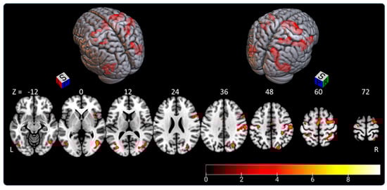 To allow us to compare our results with those of previous studies [,,,,,,], we converted the literature data into MNI coordinates using the MNI to Talairach application [,]. We visualized our results using SPM12 and the xjView toolbox (available online: https://www.alivelearn.net/xjview (accessed on 27 May 2021) and MRIcroGL (available online: https://www.mccauslandcenter.sc.edu/mricrogl/ (accessed on 27 May 2021). The interpretation was performed in MNI space, using the automated anatomical labeling atlas (AAL3) [], Jülich brain cytoarchitectonic atlas [,,,], and brainnetome atlas [] for cyto-myelo labeling. The latter, based on anatomical connectivity parcellation and containing 246 regions of the bilateral hemispheres (210 cortical and 36 subcortical subregions), was the most useful one for identifying activated regions reported in the results.