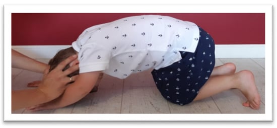 The asymmetrical tonic neck reflex (ATNR) and the symmetrical tonic neck reflex (STNR) were tested in a four four-point kneeling position. In the starting position, shoulders, hips, and knees were flexed to 90°, elbows extended, hands flat, fingers extended, with the head in a neutral position. Next, the tonic labyrinthine reflex (TLR) was tested in a standing position, feet parallel to the width of the hips and hands along the trunk. Before the reflex examination, children were asked to close their eyes.