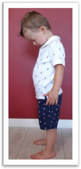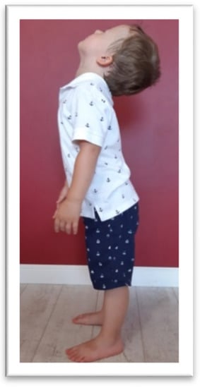 In the TLR test, the children were asked to flex and extend the head by themselves. For the TLR FLX (Figure 5) test, the children were asked to bend the head slowly, as if “looking at their feet,’’ and stand in this position for 10 s. Next, the children were asked to tilt the head back as far as possible for 10 s (TLR EXT test, presented in Figure 6). Compensation, such as fist-clenching, upper limb movements, knee deflection (in TLR FLX), or climbing on toes (in TLR EXT), and/or general balance disturbance, constituted symptoms of an active TLR.