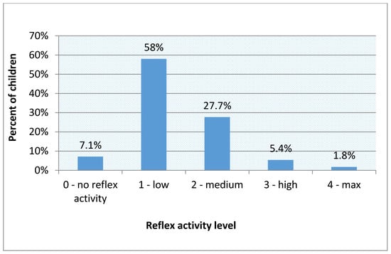 The total score (max. 24 points) for reflex examination was converted to the level of reflex activity. The results show that 7.1% of the examined children have no retained primitive reflexes. A significant part (58%) of the preschool population has a low level of reflex activity. In 27.7% of children, a medium level of reflex activity was observed. In 5.4% of participants, a high level of reflex activity was found, while the maximum level was demonstrated by 1.8% of subjects. The results of the reflex activity level are shown in Figure 7.