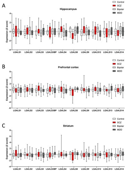 - Lanz, T.A.; Reinhart, V.; Sheehan, M.J.; Rizzo, S.J.S.; Bove, S.E.; James, L.C.; Volfson, D.; Lewis, D.A.; Kleiman, R.J. Postmortem transcriptional profiling reveals widespread increase in inflammation in schizophrenia: A comparison of prefrontal cortex, striatum, and hippocampus among matched tetrads of controls with subjects diagnosed with schizophrenia, bipolar or major depressive disorder. Transl. Psychiatry 2019, 9, 151. [Google Scholar] [CrossRef] [PubMed]