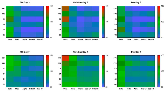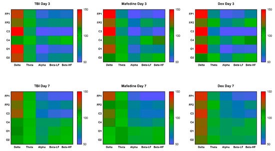 A heatmap of δ-, θ-, α-, LF and HF β-rhythm index values in channels FP1, FP2, C3, C4, O1, and O2 at post-TBI days 3 and 7. Data were normalized to the respective healthy control values.