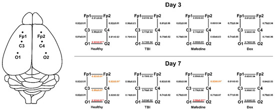Lower cross-correlations of all electrode pairs were another common feature seen in TBI rats, indicating an impairment of both inter- and intrahemispheric functional connections. The Ccr values significantly decreased (p < 0.05, p < 0.01) for electrode pair O1-O2 by post-TBI day 3, and pairs FP1-FP2, C3-C4, O1-O2, and FP2-FP4 by post-TBI day 7 (Figure 4). Mafedine administration increased Ccr values for electrode pairs FP2-C4 (p < 0.05) and O1-O2 (p < 0.01) compared to TBI group at post-TBI day 7 (Figure 4).