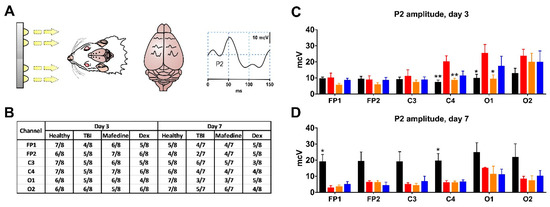 (A) a schematic representation of the VEP acquisition process. Right: an example of obtained VEP curve with a highlighted P2 peak; (B) P2 peak incidence in experimental animals at post-TBI days 3 and 7; (C,D) P2 peak amplitudes in channels FP1, FP2, C3, C4, O1, and O2 at post-TBI days 3 and 7. Black healthy controls, red TBI, orange TBI + mafedine, blue TBI + dexmedetomidine (Dex). Dex dexmedetomidine; * p < 0.05, ** p <0.01 vs. TBI.