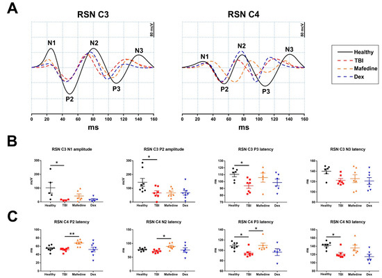 (A) averaged SSEP curves in channels C3 and C4 under right sciatic nerve (RSN) stimulation; (B) SSEP curve parameters in channel C3 under RSN stimulation. (C) SSEP curve parameters in channel C3 under right sciatic nerve stimulation. Dex—dexmedetomidine; * p < 0.05, ** p <0.01 vs. TBI.