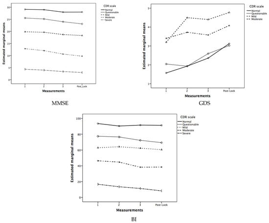 Cognitive status was measured with the Spanish version of the MMSE []. The MMSE is a widely used cognitive screening instrument whose consistency in its Spanish version varies between 0.82 and 0.84, and its inter-judge reliability varies between 0.83 and 0.99 in elderly people and patients with neurological diseases. Depressive symptomatology was measured with the Spanish version of the 15-item version of the Geriatric Depression Scale (GDS) []. The GDS is a short instrument designed to assess depressive dysfunctions in adults who are older than 65 years. The intra-observer reliability of the 15-item Spanish version is 0.95, its inter-observer reliability is 0.65, and its internal consistency is 0.99. Because it is a self-reported test, the GDS was not considered for participants who had a CDR value of 3. It is a self-reported test in which the elderly adults provided information about their affective state by using a Likert-type response scale. In participants with severe cognitive impairment (CDR = 3), the responses were not reliable and, subsequently, were not analyzed when we studied the depressive symptomatology. For other analyses that did not use self-reported information, the participants with CDR = 3 were included. The functional status was measured with the Spanish version of the Barthel Index (BI) []. The BI is the most commonly employed questionnaire for the evaluation of functionality in the Spanish context, although its psychometric properties are less well known. Gonzalez et al. obtained Cronbach’s alpha coefficients that were greater than 0.87, and a confirmatory factor analysis supported its unidimensionality []. In each of the three pre-lockdown evaluations and in the post-lockdown evaluation, the same evaluation instruments were used.