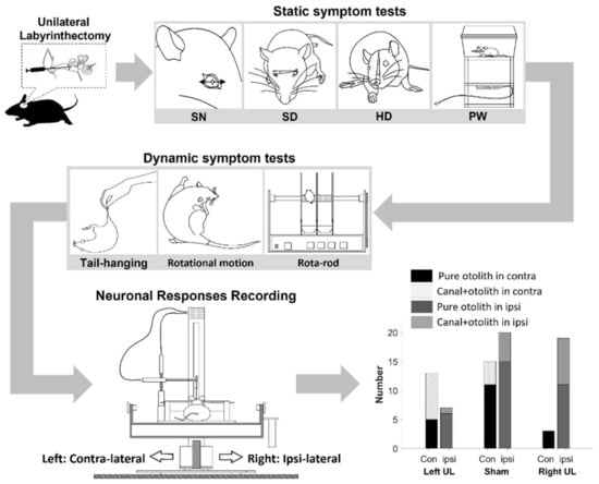 Although some UL models showed several different symptoms, there were no UL models that revealed all the symptoms. For example, a UL model (#02-1204) tilted its head (39.43 deg), and its performing time on the rota-rod dramatically decreased from 147 to 3.25 s before and after FeCl3 injection, respectively. However, its skew deviation and spontaneous nystagmus (SN) were not clearly observed. On the other hand, some UL models had no symptoms in both skew and head deviation, but their paw distance and tail hanging indicated that the chemical injection clearly damaged the peripheral vestibular system. Therefore, the assessed symptoms were determined when a UL model presented clear symptoms. According to this approach, Table 1 was summarized, and all UL models revealed two or more evident symptoms from the static and dynamic tests. For instance, the symptom of SN was observed in 7 right UL and 3 left UL animals, and half of the UL models (10/19, 52.63%) showed SN overall. Another symptom, such as tail-hanging, appeared in most UL models (15/19, 78.95%), showing a relatively high percentage in the population. As expected, the sham group had few symptoms related to unilateral vestibular dysfunction in the static and dynamic tests. Figure 1 illustrates the schematic overview of the experimental procedures. In short, the models were constructed by UL using FeCl3. Once the animals were awakened, some selected behavioral tests were applied to assess unilateral vestibular dysfunction. Following the tests, neuronal recording was performed to identify directional preference.