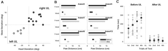 Behavioral responses before and after UL. (A) Relation between the degree of the head (HD) and the ocular skew deviation (SD). (B) Front and hind paw distances from 6 selected animals: Each bar represents the range of paw distance. (C) Rota-rod tests: For each condition, animals were tested 4 times.
