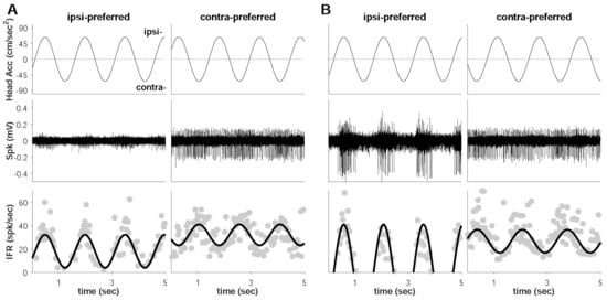 Ipsi- and contra-preferred neuronal examples responding to head acceleration. (A) Examples of neuronal responses from sham. (B) Examples of neuronal responses from labyrinthectomy model. At the bottom, the gray dots represent IFR, and the black line indicates their relevant curve-fitting based on Equation (1).