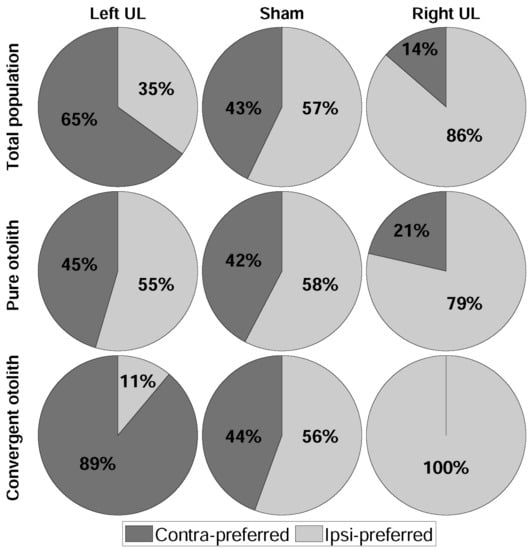 Background: The directional preference of otolith-related vestibular neurons elucidates the neuroanatomical link of labyrinths, but few direct experimental data have been provided. Methods: The directional preference of otolith-related vestibular neurons was measured in the vestibular nucleus using chemically induced unilateral labyrinthectomy (UL). For the model evaluation, static and dynamic behavioral tests as well as a histological test were performed. Extracellular neural activity was recorded for the neuronal responses to the horizontal head rotation and the linear head translation. Results: Seventy-seven neuronal activities were recorded, and the total population was divided into three groups: left UL (20), sham (35), and right UL (22). Based on directional preference, two sub-groups were again classified as contra- and ipsi-preferred neurons. There was no significance in the number of those sub-groups (contra-, 15/35, 43%; ipsi-, 20/35, 57%) in the sham (p = 0.155). However, more ipsi-preferred neurons (19/22, 86%) were observed after right UL (p = 6.056 × 10−5), while left UL caused more contra-preferred neurons (13/20, 65%) (p = 0.058). In particular, the convergent neurons mainly led this biased difference (ipsi-, 100% after right UL and contra-, 89% after left UL) (p < 0.002). Conclusions: The directional preference of the neurons depended on the side of the lesion, and its dominance was mainly led by the convergent neurons.
