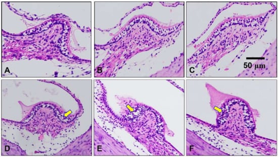 The histological tests on the peripheral vestibular area showed the damages from FeCl3 injection (Figure 5). The first row (A–C) shows the vestibular crista of the shams, and there were few damaged structures around the vestibular crista, while those of the labyrinthectomy models had interrupted vacuoles in the structure of the vestibular crista (marked by yellow arrows, D–F), agreeing with previous studies [26,27]. These interrupted swellings were observed around the crista of labyrinthectomy models, indicating vestibular damage from the chemical injection.