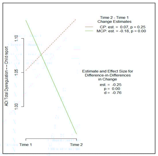 Children in MCP exhibited a significantly greater reduction in total dysregulation on the ADI compared to children in CP, yielding a moderate–large effect size (Cohen’s d = −0.76, 95% CI [−1.40, −0.10], p = 0.001). Figure 1 depicts this finding.