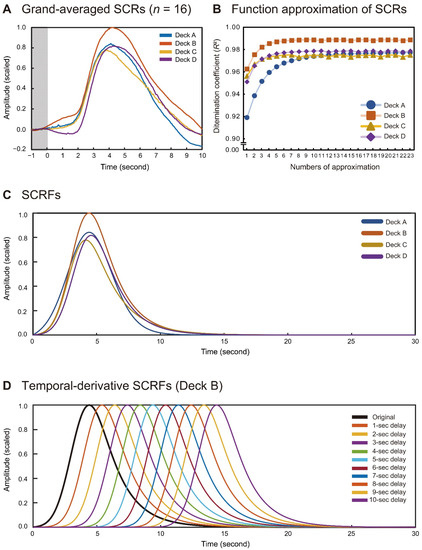 Comparisons of total averaged SCRs for the four card decks in Experiment 1 (n = 16) (A). Transition of determination coefficients (R2) during the recursive function approximation of the original SCRs (B). SCRFs obtained for the four card decks (C) and temporal-derivative SCRFs exemplified for Deck B (D).