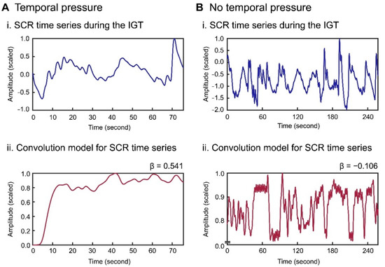 SCR time series recorded during the IGT (i) and the corresponding linear convolution model (6-s delay model) using SCRFs (ii) for one participant under the temporal pressure conditions (A) and the no temporal pressure conditions (B).