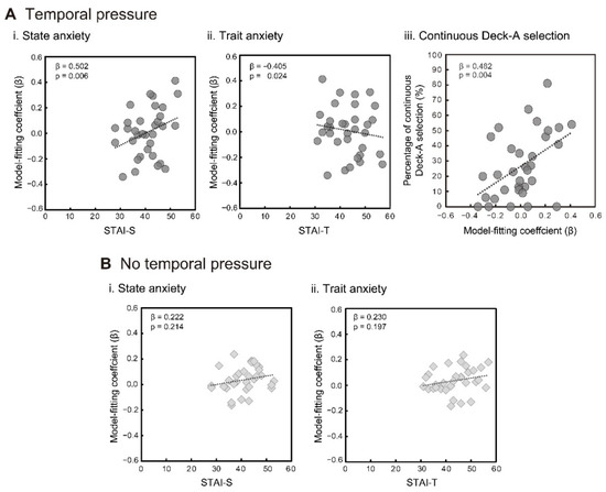 Relations between the participants’ anxiety scores (STAI-S and STAI-T) and their model fitting coefficients (β) for the temporal pressure condition (Ai,Aii) and the no temporal pressure condition (Bi,Bii) (n = 33). Relation between continuous Deck A selection and model fitting coefficients for the temporal pressure condition (Aiii). Beta coefficients were calculated via multiple regression analyses, while the original data were plotted in each graph.