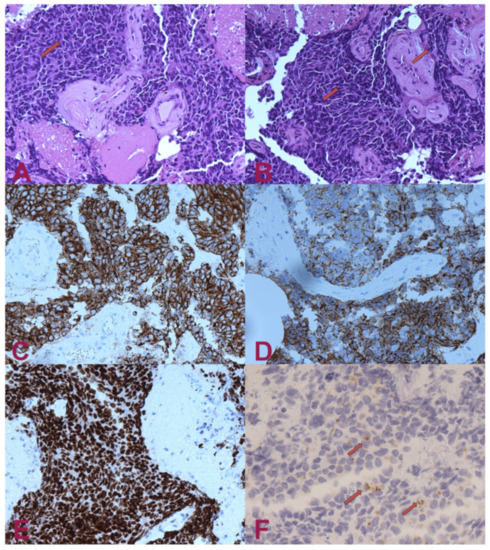 Histologic examination. (A) H.E.— small-cell carcinoma infiltrating nervous tissue. The cells have small, intense hyperchromatic nuclei, rounded and polygonal-shaped, and scant cytoplasm. Occasionally, it is possible to note “moulding” signs among the nuclei (arrow). (B) H.E.— in some areas, the nuclei have elongated shape (“fusiform”) or squashed (arrows). (C) Pan-cytokeratin (clone AE1/AE3)— the cytoplasm of the tumour cells are positive for cytokeratin. Staining for pan-cytokeratin, such as AE1/AE3, helps demonstrate that the tumour is a carcinoma rather than a lymphoid lesion (pan-CK negative and CD45 positive). (D) Positivity for cytokeratin 7 (CK7). Small-cell lung carcinoma (SCLC) is usually positive for CK7 and negative for CK20. About half of SCLC stain with CK7 and <10% with CK20. (E) Transcriptional Thyroid Factor 1 (TTF1)— strong positivity for TTF1 in almost all neoplastic cells is characteristic, but not specific, for small-cell carcinoma of the lung. Although the stain is less intense, it can be positive in 44–80% of extrapulmonary small-cell carcinomas. (F) Chromogranin A— dot-like granular positivity for chromogranin A is a marker of neuroendocrine differentiation of the neoplasm. Up to two-thirds of SCLC are negative for chromogranin and synaptophysin. When these markers are positive, this means that they have high specificity for neuroendocrine differentiation, unlike CD56, which is highly sensitive but not very specific. CD56 will stain approximately 90–100% of cases; however, it is less specific. The interpretation for SCLC diagnosis needs to be performed carefully in the appropriate morphological context and characteristics.