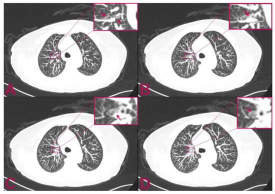 Postoperative multilayer spiral CT scan of the chest with intra-venous administration of contrast medium. The patient is affected by intramedullary cervical metastasis from a primary small-cell neuroendocrine carcinoma of the lung. (A,B) Axial views show two small, rounded, and confluent nodules located at the level of the superior segment of the right upper lobe of the lung which have a maximum diameter of 9 × 3 mm. (C,D) The CT axial view shows an additional 2.5 mm abnormal small, solid nodular formation that is located caudally to the previously indicated nodules. The mass appears adherent to the bronchial tube and measures 8 mm in maximum diameter.