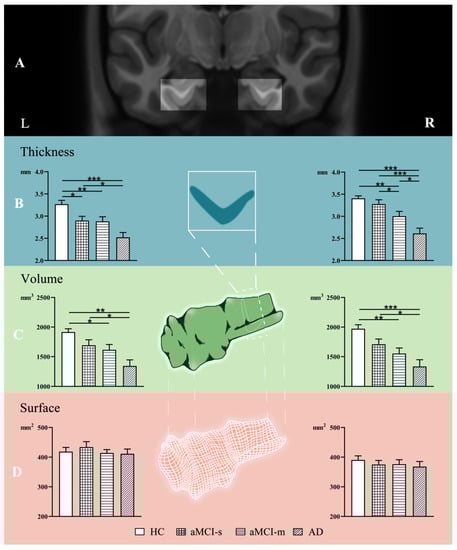 - Dickerson, B.C.; Feczko, E.; Augustinack, J.C.; Pacheco, J.; Morris, J.C.; Fischl, B.; Buckner, R.L. Differential effects of aging and Alzheimer’s disease on medial temporal lobe cortical thickness and surface area. Neurobiol. Aging 2009, 30, 432–440. [Google Scholar] [CrossRef] [PubMed] [Green Version]