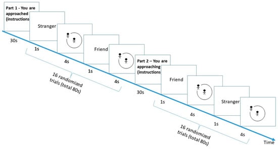 Interpersonal distance also depends on whether one is approaching someone or is being approached. For instance, the hypothalamic peptide oxytocin (OT) significantly increased the preferred distance from a stranger but not from a friend who was approaching the participant [,]. Interestingly, the reversed pattern was found when the participant was the one approaching []. These findings suggest that one variation (passively being approached) activates the avoidance/threat system more, and the other variation (actively approaching) activates the approach/reward system more. Indeed, it was shown that being approached results in a greater distance than actively approaching [,]. However, no study to date has examined loneliness in this context. Therefore, the first aim of the current study was to characterize the preferred distance from friends vs. strangers in different approach conditions in chronic loneliness.