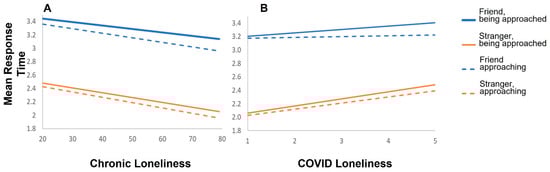 (A). Higher chronic loneliness is associated with a faster response time (preference for a greater distance) across all conditions. (B). The reverse pattern exists for COVID-19 loneliness. Higher COVID-19 loneliness is associated with a slower response time (preference for a smaller distance) in all conditions.