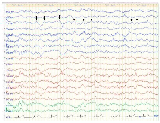 Scalp electroencephalogram of anterior–posterior bipolar montage using 10–20 International System shows medium to high amplitude sharply contoured focal slowing over the left mid-posterior temporal region (arrows). Monomorphic, medium amplitude 3–5 Hz delta and theta activities were seen in the same region (arrowheads).