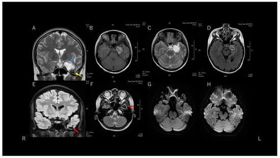 A lesion is evident in the left temporal fossa. This lesion consists of two components, indicated by sky blue and yellow arrows (A). Axial T1-weighted imaging (WI) and T2-WI (B,C) show heterogeneous and hyperintense parts, respectively. Since a thin space exists between the lesion and temporal lobe structures, this component is considered an extra-axial lesion. This component is displacing the temporal lobe and hippocampus (D). The other component is located within the temporal lobe, appearing as a low-intensity cystic lesion (E,F: red arrows). Diffusion WI (G,H) shows heterogeneous, slightly hyperintense findings.