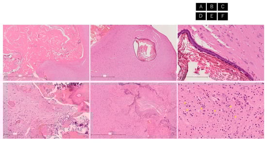 The massive cystic lesion depicted on MRI contains keratinaceous debris (A). In the brain parenchyma, other small cystic structures are apparent (B). These small cystic structures have an epithelial lining of keratinized, stratified squamous epithelium and are seen in the cortex (C). Some parts of the cyst epithelium contain bone components (D). Hairs are also seen adjacent to the bone components and in the brain parenchyma (D). The keratinized substance is present in a form that is involved in brain parenchyma, and surrounding glial cell proliferation is observed (E). Near the keratinized substance, many dysmorphic neurons (representative neurons; yellow arrowhead) are situated in the white matter. The neurons range from normal-sized to enlarged and show cytologic atypia such as abnormalities of nuclear shape, size, or nucleolar morphology, indicative of focal cortical dysplasia (F).