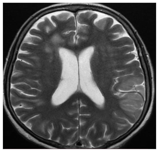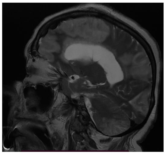 When considering inflammatory manifestations, we detected two patients with encephalitis (1.98%) and two cases with Guillain–Barré Syndrome (GBS) (1.98%). Both patients with encephalitis were females, 78 and 76 years of age with comorbidities (hypertension, atrial fibrillation, and prior lacunar ischemic stroke), who were admitted to the intensive care unit due to severe bilateral pneumonia (RT-PCR-positive for severe acute respiratory syndrome coronavirus type 2) requiring mechanical ventilation. There, patients were in a superficial coma at onset, with a focal neurological deficit such as hemiparesis or paraparesis, psychomotor agitation, and generalized seizures. Neuroimaging (MRI) showed bilateral cortico-subcortical hyperintense lesions (Figure 1, Figure 2, Figure 3, Figure 5 and Figure 6) with vasogenic edema in the frontal, parietal, and temporal lobes. In one of the patients, secondary hydrocephalus appeared as a complication, for which external drainage was installed (Figure 4). In the first case (female, 78 years of age), the CSF analysis was negative for bacterial or fungal infections; the protein levels (10.09 g/L) and leucocyte number (50 uL) were increased in the CSF, although the glucose level was decreased (27 mg/dL). In the second case (female, 76 years of age), the CSF protein level was 7.2 g/L, the leucocyte number was 50 uL, and the glucose level was 50 mg/dL. The blood test parameters showed high levels of the blood glucose, LDH, hsCRP, ESR, D-dimer, fibrinogen, and severe thrombocytopenia. The blood cultures of the two patients were negative for aerobic germs, anaerobes, and fungi.