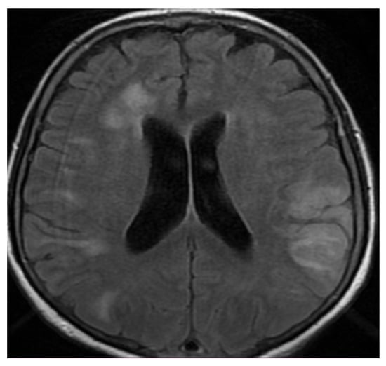 MRI axial fluid-attenuated inversion recovery (FLAIR) image showing bilateral subcortical hyperintense lesions in the frontal, parietal, and temporal lobes, without significant enhancement, compatible with encephalitis. MR venography 2D-TOF (2D time-of-flight) excluded cerebral venous sinus thrombosis.