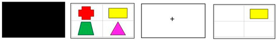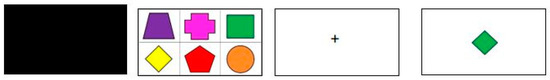 Task 1 (Visual Binding Task 1 (VBT1)) is based on the color–shape combination condition in Allen’s classic task (2006). The color–shape combinations are created randomly from a pool of 8 colors (red, yellow, blue, pink, purple, brown, orange, green) and 8 shapes (square, cross, circle, pentagon, trapeze, rectangle, triangle, diamond). All items appear in a balanced amount. In the beginning, 6 colored shapes appear on the screen in a 3 × 3 grid for 2000 ms (2 s). The participants are instructed to remember the color–shape combinations. After a fixation interval of 2000 ms, during which a white screen with a black fixation cross in the center appears, one color–shape combination appears in the center of the screen, and just as in the task of Allen, Baddeley and Hitch [17], participants are instructed to judge whether the probe is one of the six in the original array. There is no time limit for the test’s recognition phase, and accuracy is emphasized over speed. Participants are instructed to select, using the computer mouse, the “True” or “False” button under the probe, according to whether the shape was presented earlier or not. After that, they move on to the next set of shapes (Figure 1).