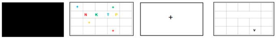 Task 3 (MBT) is a multimodal binding task in which verbal information was combined with spatial information, based closely on the cross-modal binding task of Quinette et al. [54], as derived from Mitchell et al. [23] and Prabhakaran et al. [52]. Firstly, 4 colored upper-case consonants (from the Greek alphabet, font Ariel, size 12) are displayed in the center of a 5 × 4 grid, and 4 colored crosses are placed randomly in the remaining 17 squares (green, blue, red and yellow). Participants are informed that each letter is matched with a location, as represented by the crosses, according to their common color, and are instructed to remember these pairs. Afterward, there is a fixation cross of 2000 ms, during which participants have to maintain the 4 associations. In the test phase, the same 5 × 4 grid is provided, with a single lower-case consonant (same as one of the previous 4 capital letters) presented in black color inside one of the squares. Participants are instructed to judge by selecting “True”/“False” buttons, using the computer mouse, if the location of the singular letter is correct depending on whether the matching is the same as before (Figure 3). As in the previous tests, there is no time limit in the test phase, and accuracy is emphasized over speed.