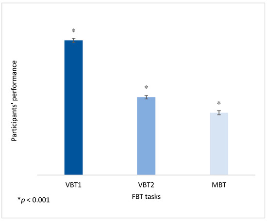In order to examine the specific effects of the independent variables and their interactions on each FBT task, we proceeded to the inspection of the results of each one of a series of ANOVAs. As Levene’s test for equality of variances was statistically significant for VBT1 (p < 0.001) and MBT (p < 0.05), only values of high statistical significance were accepted. The inspection of the subsequent ANOVAs did not show any statistically significant effect.