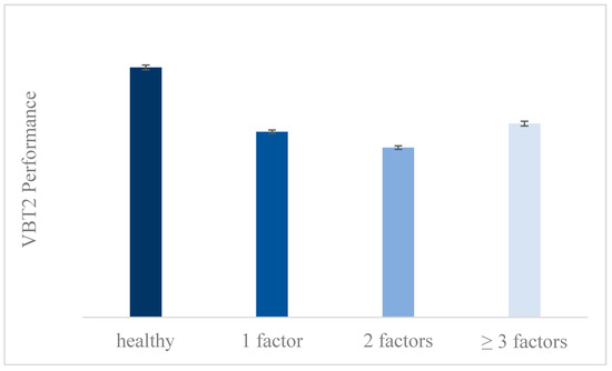 In order to examine the specific effects of the independent variables and their interactions on each FBT task, we proceeded to the inspection of the results of each one of a series of ANOVAs. As Levene’s test for equality of variances was statistically significant for VBT2 and MBT (p < 0.05), only values that were of high statistical significance (p < 0.001) were accepted. The results showed a main effect of VRP only on VBT2 (F(3, 120) = 8.594, p < 0.001, ηp2 = 0.18), with healthy participants showing a clear tendency of higher performance (M = 29.564) than participants who suffer from one (M = 21.944), two (M = 20.064) or three (Μ = 22.458) vascular risk factors (Figure 5). However, there was no statistically significant difference among them in pairwise comparisons.